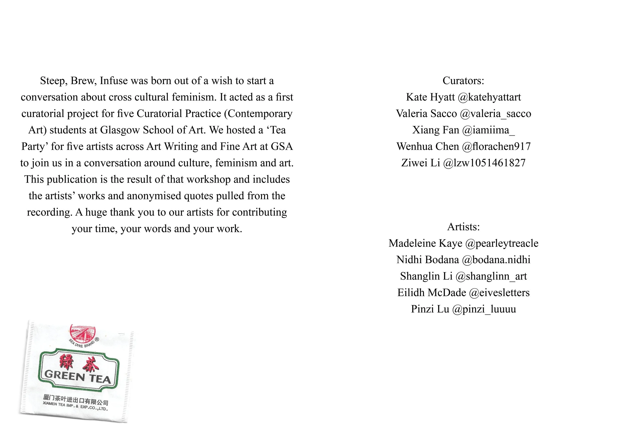 This project served as a first curatorial exploration for myself, Valeria Sacco, Wenhua Chen, Xiang Fan and Ziwei Li, all students on the Curatorial Practice (Contemporary Art) Masters at Glasgow School of Art. We wished to start a conversation about cross cultural feminism and hosted a ‘Tea Party’ for five artists across Art Writing and Fine Art at GSA to join us in a conversation around culture, feminism and art. This publication is the result of that workshop and includes the artists’ works and anonymised quotes pulled from the recording. Below is a picture of the publications and a digital version to flip through.